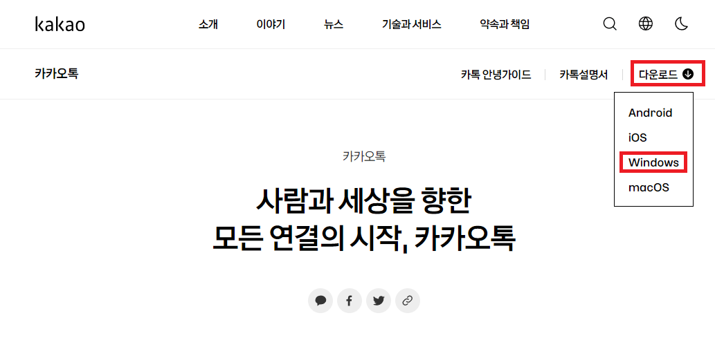 1. 카카오톡 홈페이지에서 '다운로드'를 클릭하면 안드로이드, iOS, Windows, macOS 등 선택할 수 있는 화면이 나옵니다.