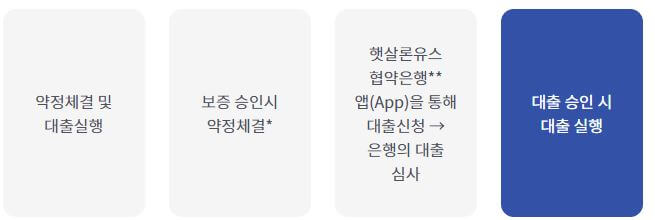 ** 보증약정 이후 협약은행(기업, 신한, 전북은행) 중 우대서비스 등을 비교하여 원하는 은행에 대출신청 가능합니다.